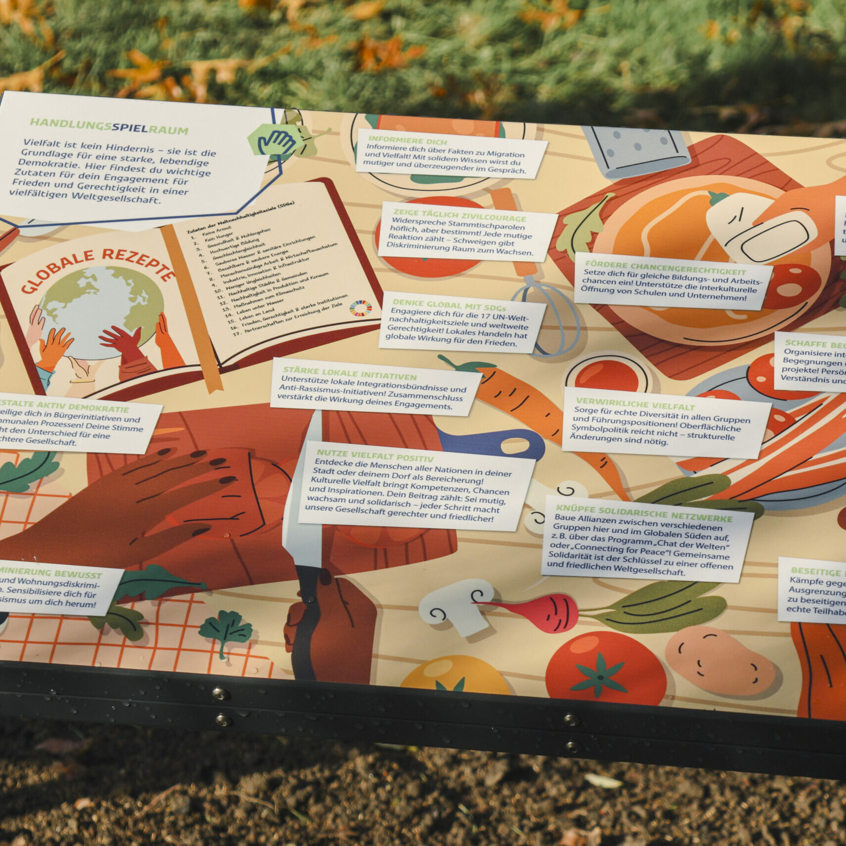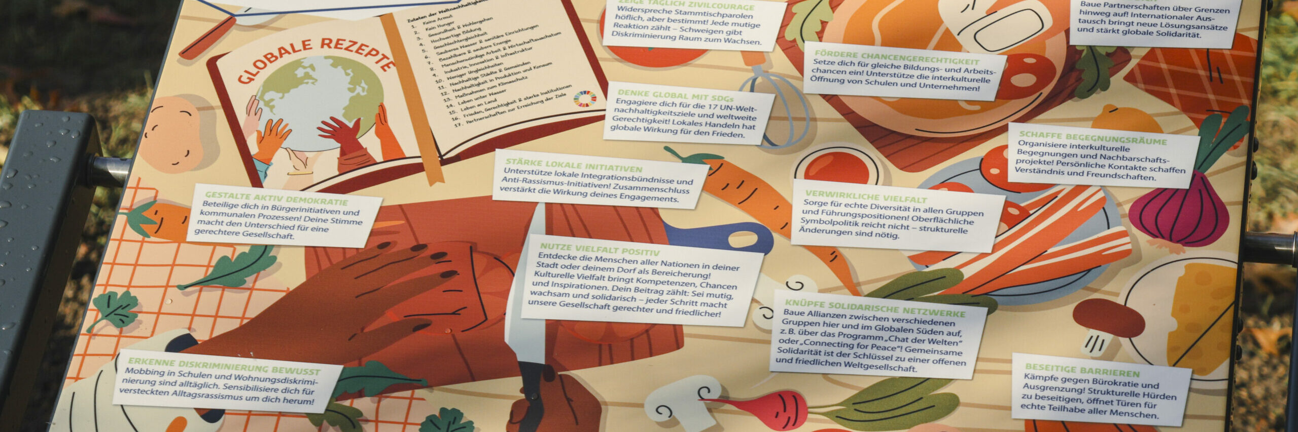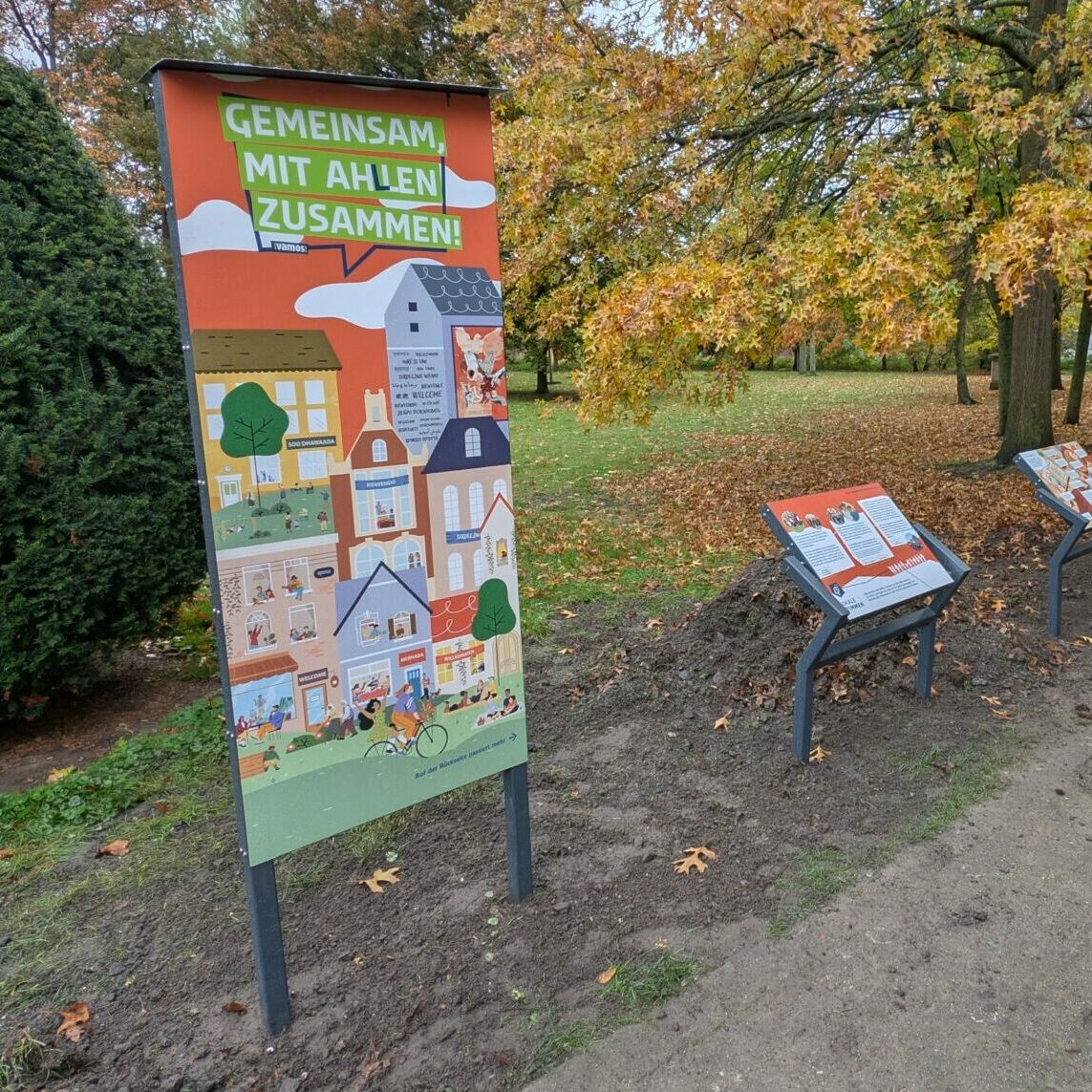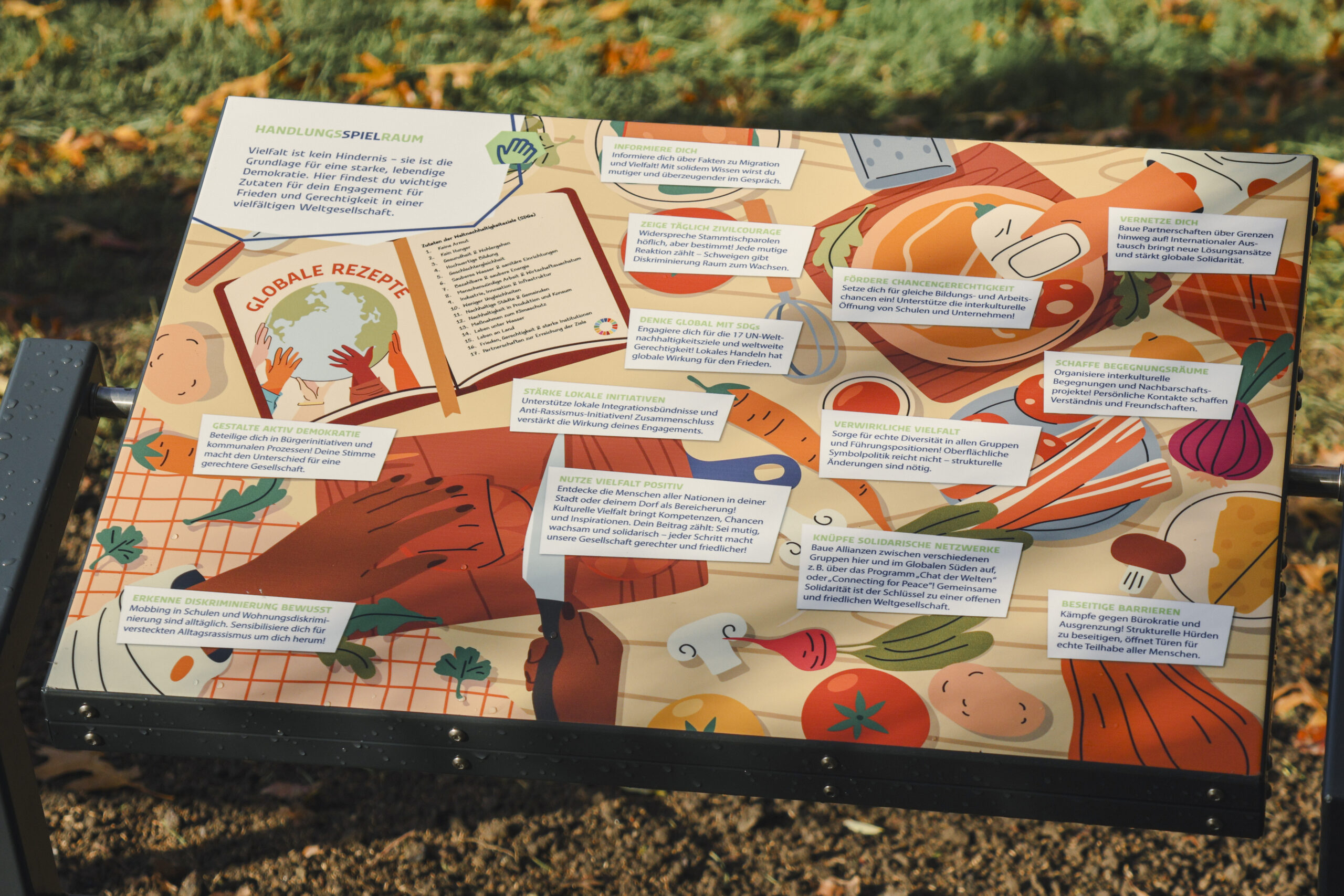 Die Mitmachstation „Frieden und Gerechtigkeit“ befindet sich im Park der Begegnungen in Ahlen im Münsterland. Die Station stellt lokale wie globale Perspektiven rund um Frieden, Gerechtigkeit, Versöhnung und Miteinander in einer vielfältigen Stadt- und Weltgesellschaft dar – historisch wie aktuell. Hier erfährst du mehr zur Station.