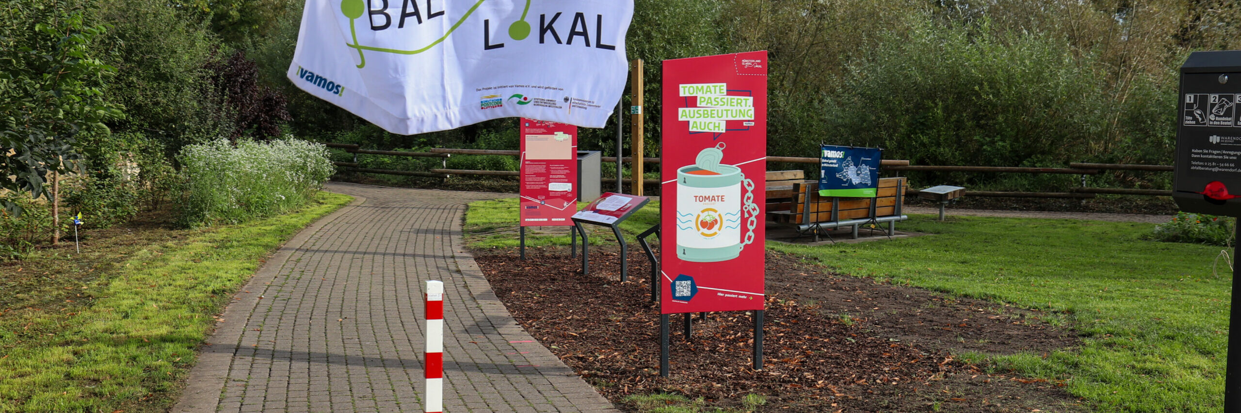„Tomate passiert. Ausbeutung auch.“ – so leitet die Mitmachstation in das Thema Tomaten und Arbeit ein. Sie befindet sich am Emsufer in Warendorf, neben Gemüsebeeten der „Essbaren Stadt“. Das Thema der Station sind faire Arbeitsbedingungen am Beispiel der Tomate – hier und in Süditalien, wo viele Menschen aus afrikanischen und asiatischen Ländern als Erntehelfer:innen arbeiten. Hier erfährst du mehr über die Inhalte der Station.
